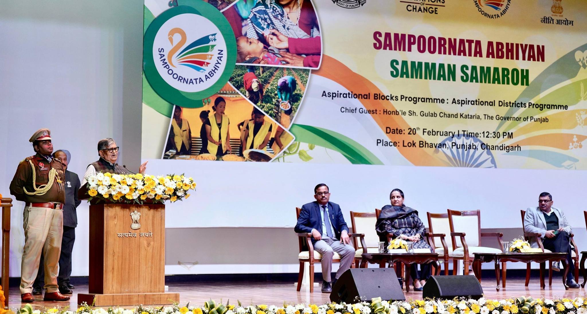राज्यपाल गुलाब चंद कटारिया  ने ‘संपूर्ण अभियान सम्मान समारोह’ की अध्यक्षता करते हुए कहा कि सीमावर्ती ब्लॉकों को आकांक्षी ढांचे में शामिल करके लक्षित परिवर्तन और अभिसरण-आधारित कार्रवाई के माध्यम से पिछली वित्तपोषण संरचनाओं द्वारा छोड़े गए अंतर को भरा जा सकता है। उन्होंने जोर दिया कि सच्चा विकास सबसे कमजोर लोगों के उत्थान से मापा जाता है, न कि केवल तेज़ी से प्रगति करने वालों से।